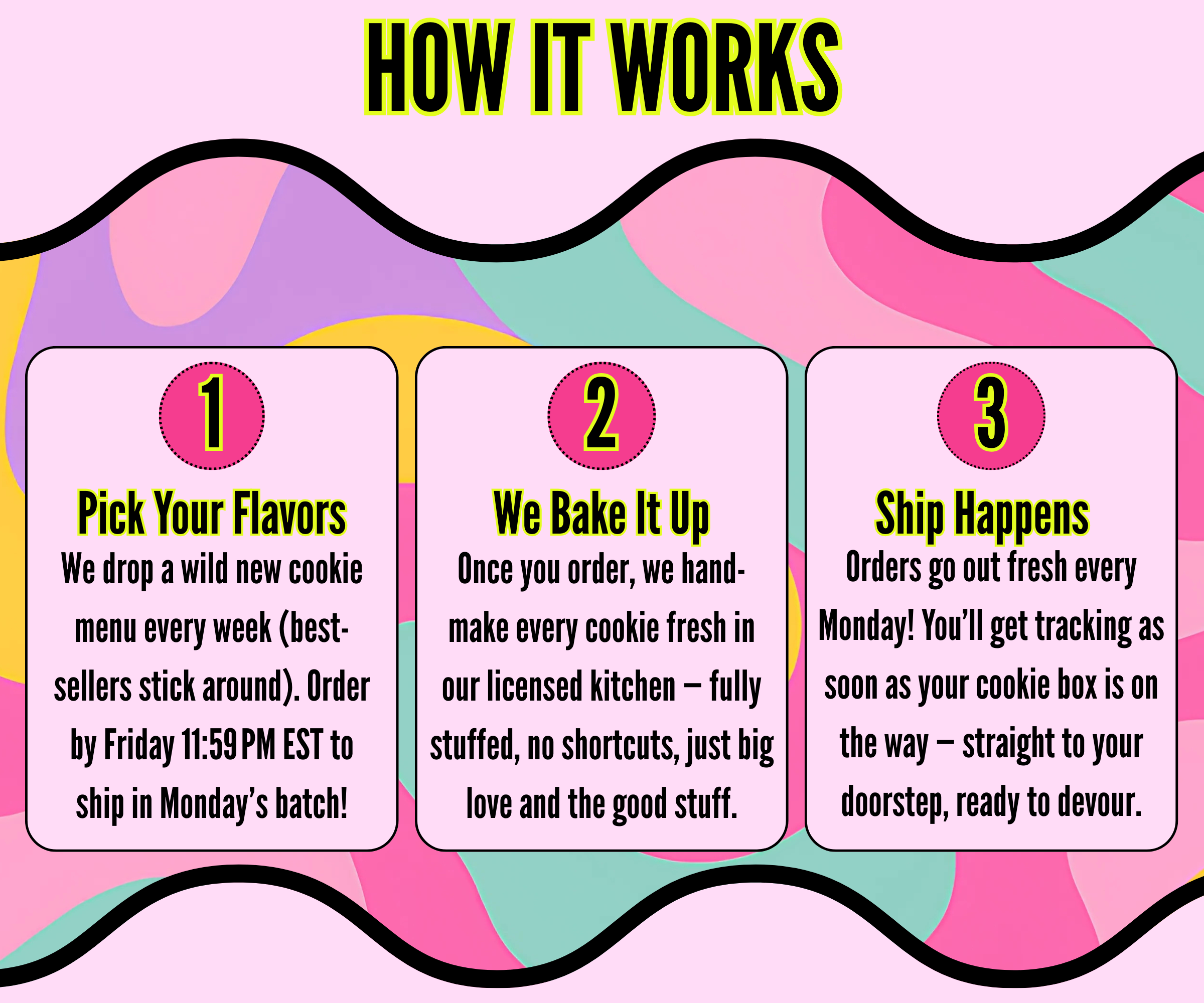 Every Saturday at between 12 PM & 3 PM EST, the menu gets restocked & we unleash our newest lineup of over-the-top dessert cookies — fresh-baked, fully stuffed, and loaded with chaos. These aren’t your everyday sweets. They're half-pound cookie bombs, unapologetically indulgent and handcrafted with love (and zero chill).