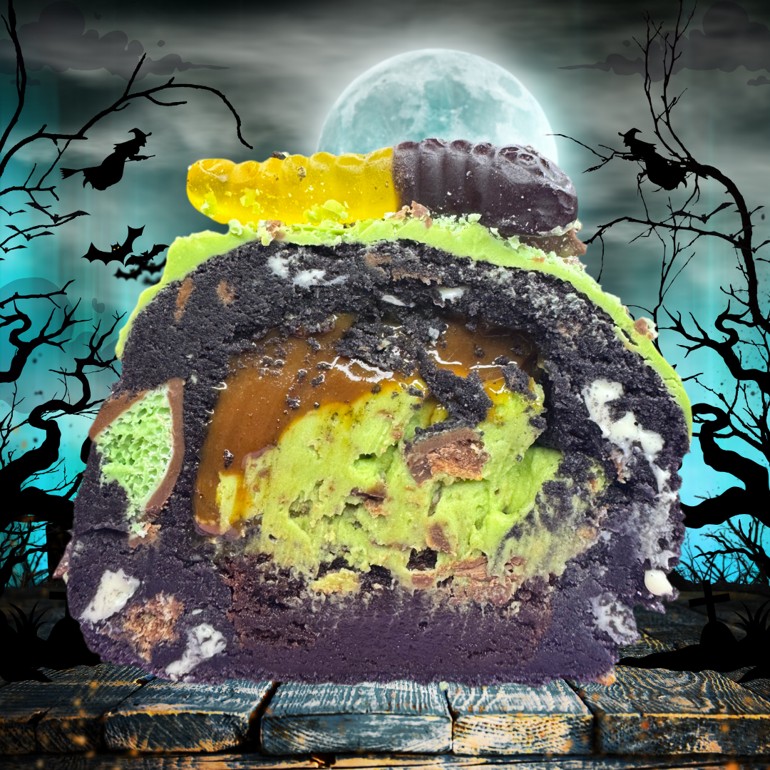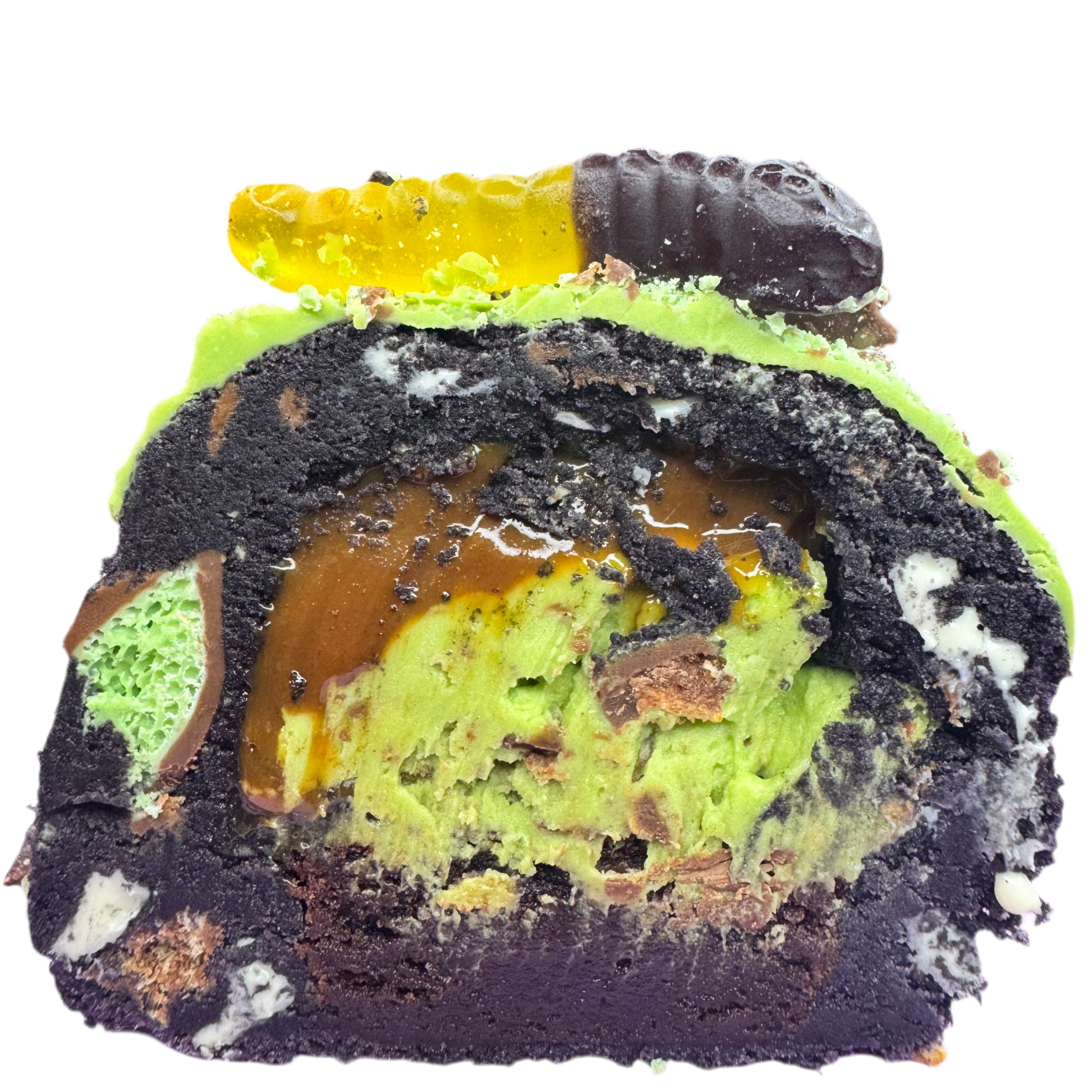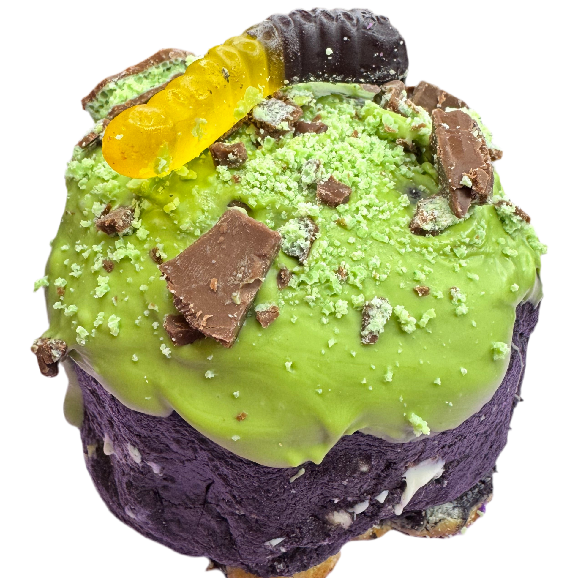 A rich black cocoa cookie base packed with chopped KitKat® bars, bubbly Mint Aero® chunks, and creamy white chocolate chips. At the center? A fudgy brownie topped with molten caramel and an oozy swirl of green-dyed KitKat® cheesecake frosting for that signature slime effect. Each one is finished with a glossy green white chocolate glaze, more Mint Aero® crumble, and a gummy worm crawling out of the chaos. It’s minty, fudgy, gooey, crunchy — Beetlejuice in cookie form