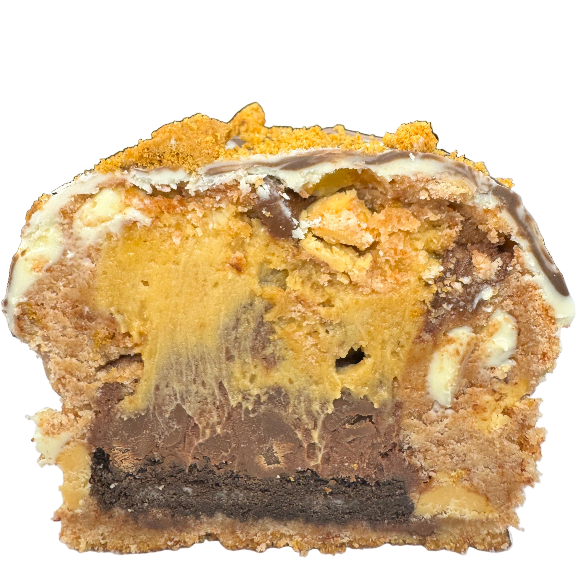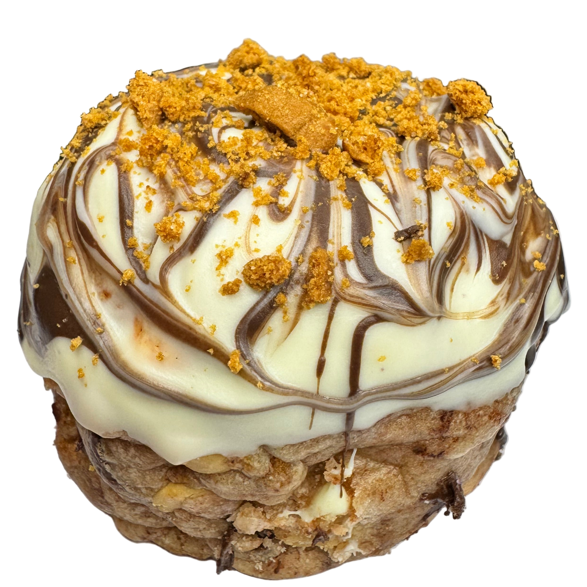 This one’s pure golden indulgence. A brown sugar Biscoff® blondie cookie base loaded with Rolo® chocolates, milk chocolate chips, white chocolate chips, butterscotch chips, and crushed Lotus Biscoff® cookies. Inside, a rich chocolate cheesecake rests on a buttery Oreo® crust, topped with a smooth caramel–Biscoff® cream cheese buttercream. Each cookie is dipped in a white and milk chocolate swirl glaze and finished with a crumble of more Lotus Biscoff® cookies. Buttery, chocolatey, and dangerously addictive — this one’s guaranteed to butter you up.