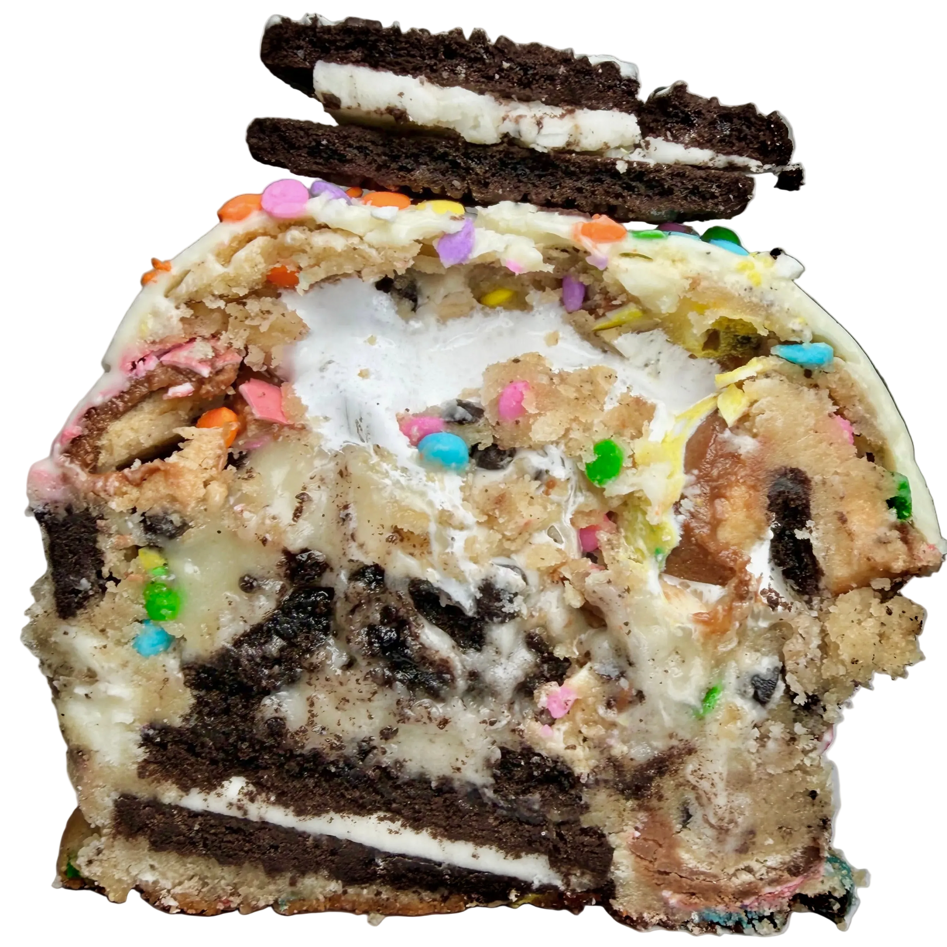 Inside, this cookie is stuffed with Oreo® buttercream, rich white chocolate ganache, and fluffy marshmallow for a layered, gooey center.