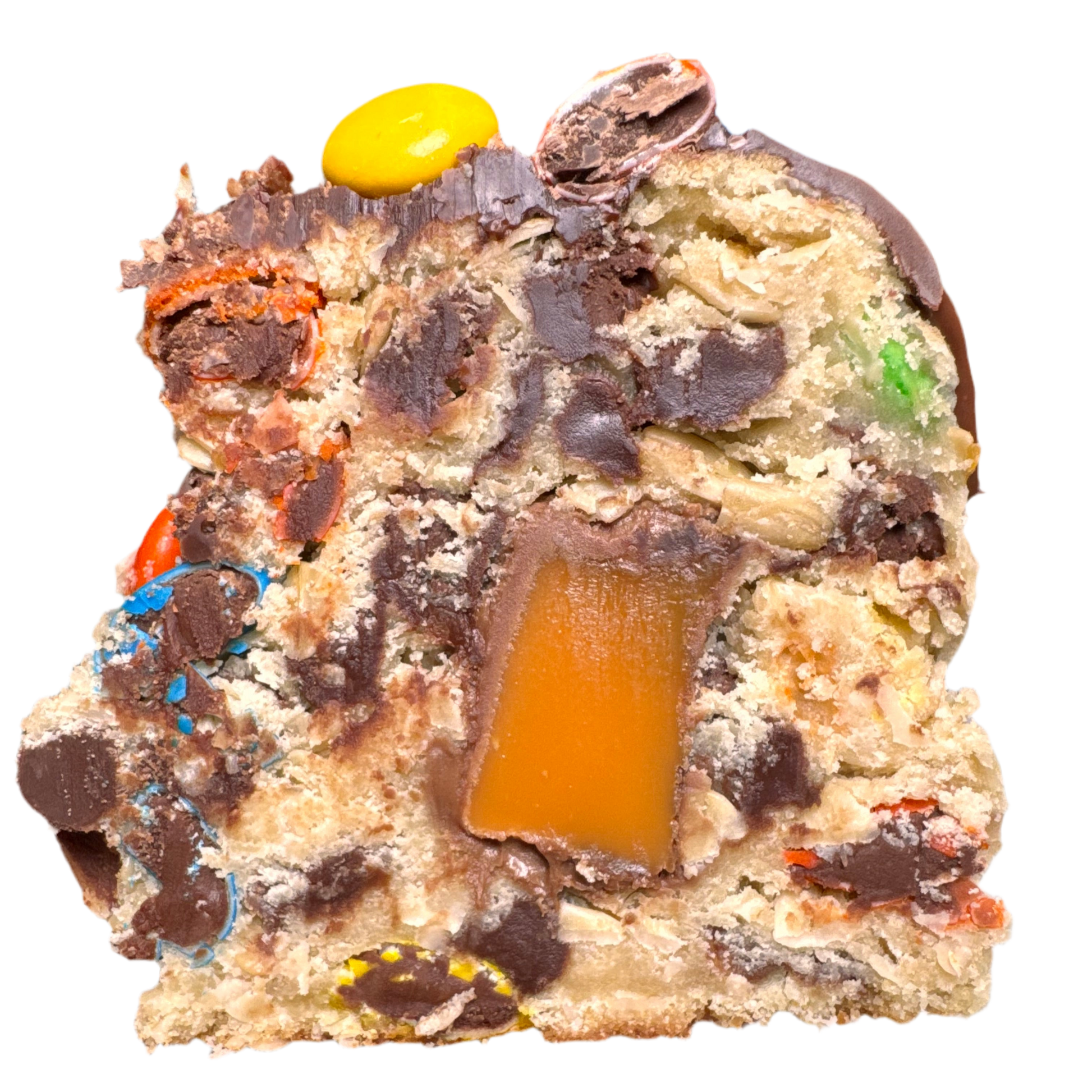 This isn’t your average oatmeal chocolate chip cookie. It’s soft, chewy, and absolutely loaded with colorful M&M® candies, rich chocolate chips, and a gooey salted caramel truffle baked right into the center. Every bite delivers that nostalgic cookie-jar comfort with a molten caramel twist — chewy, chunky, and unapologetically extra.