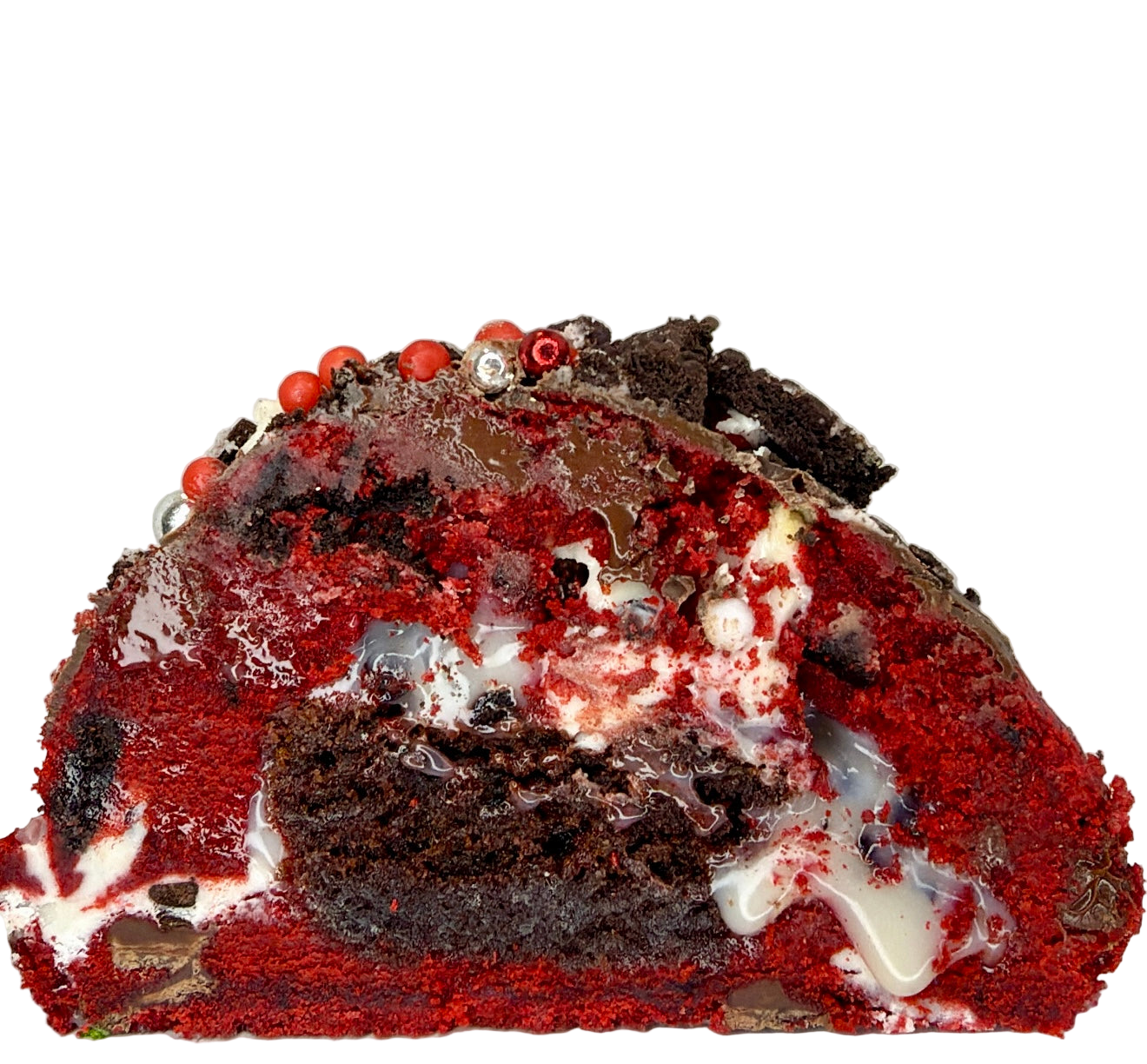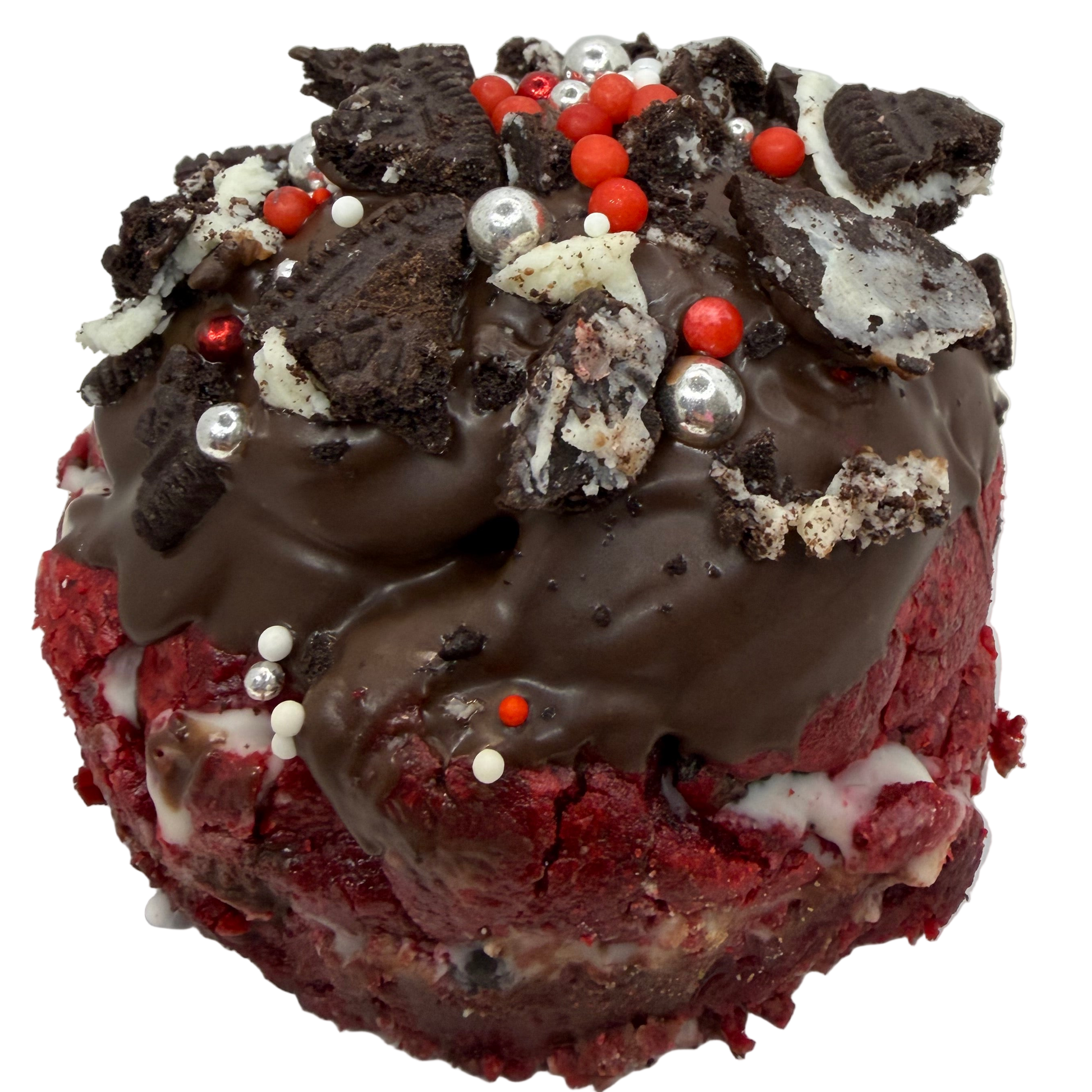 The cookie that dresses up for Christmas. Santa’s Suit features a decadent red velvet cookie base loaded with semi-sweet chocolate chips, crushed Oreo® cookies, and Hershey’s® Cookies ’n’ Creme chocolate chunks for that full cookies-and-cream overload. Inside is a thick, fudgy brownie topped with a vanilla-bean cookies-and-cream ganache that melts into every bite.