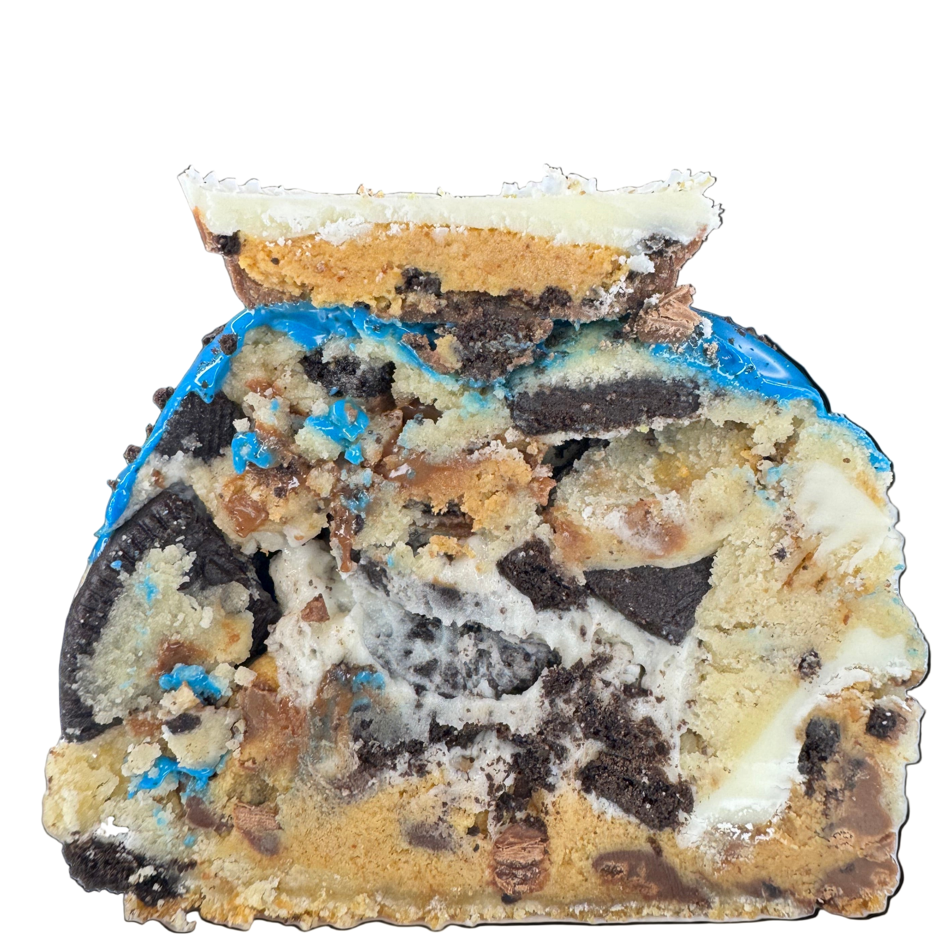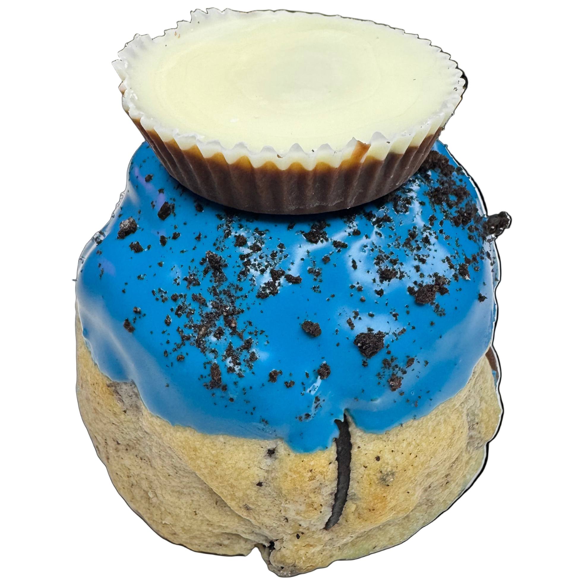A thick sugar-cookie base loaded with chopped Reese’s® × Oreo® Peanut Butter Cups and crushed Oreo® cookies, stuffed with a gooey peanut-butter chocolate-chip cookie dough center. It’s topped with a swirl of Oreo® cheesecake frosting, dipped in a blue-white-chocolate glaze, and finished with crushed Oreos and a full Reese’s® × Oreo® Peanut Butter Cup right on top. Sweet, salty, creamy, crunchy — basically a sugar high with commitment issues.