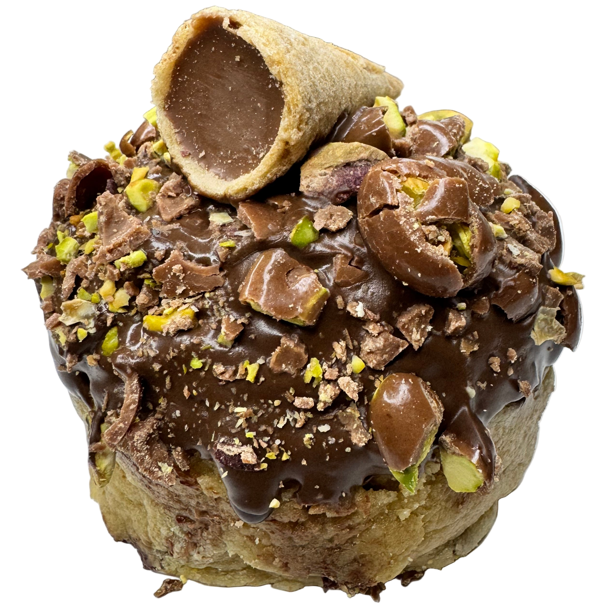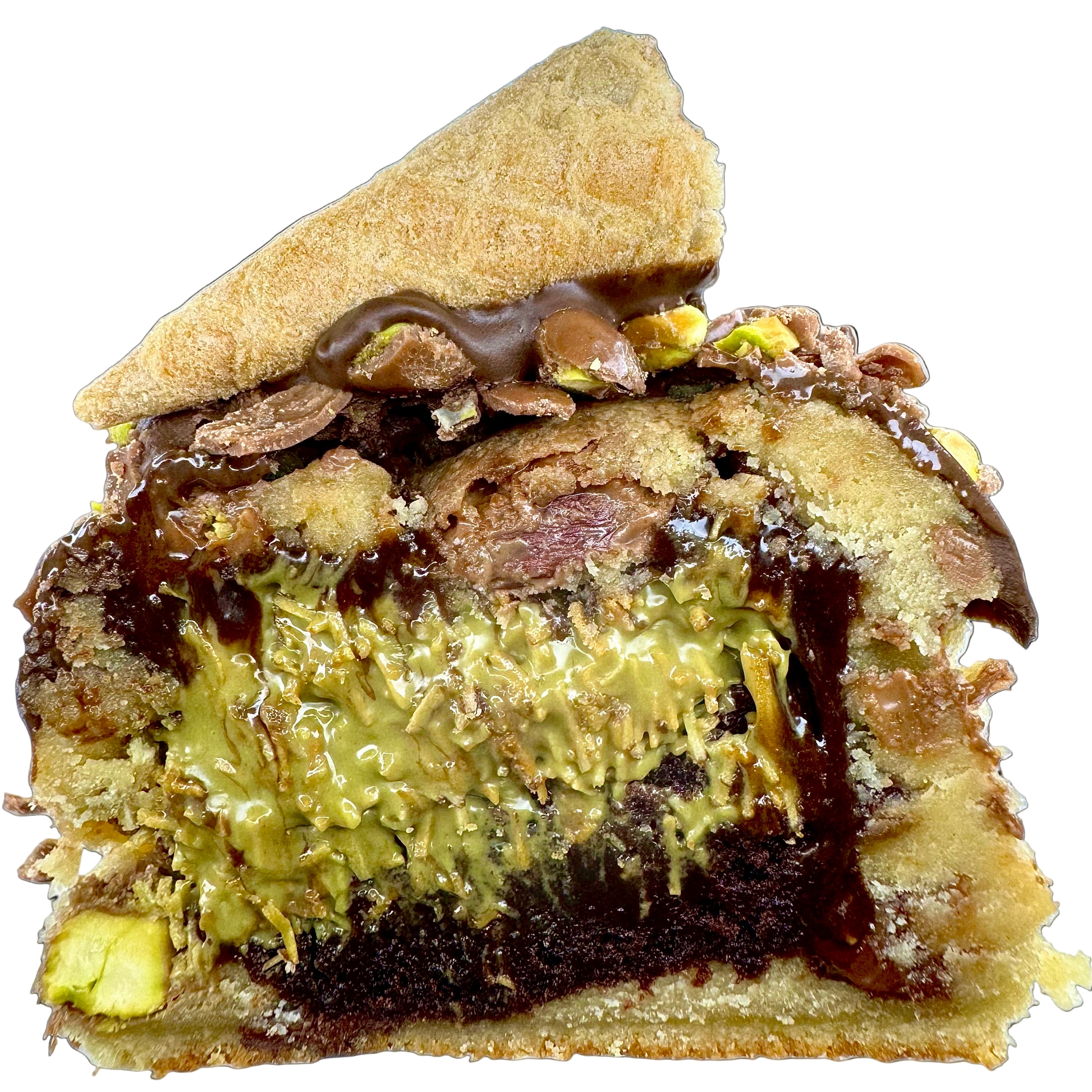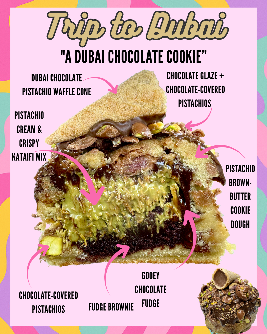 Trip to Dubai begins with a pistachio brown-butter cookie dough, loaded with chocolate chips and chocolate-covered pistachios for a warm, roasted, buttery depth. Inside, a three-layer core, a dense fudge brownie, crowned with a Dubai-style pistachio cream & crispy kataifi mix, and then sealed with a layer of gooey chocolate fudge. Each cookie is then dipped in chocolate, sprinkled with more chocolate-covered pistachios for crunch and topped with a mini Dubai-style chocolate pistachio waffle cone—because extra is the assignment.